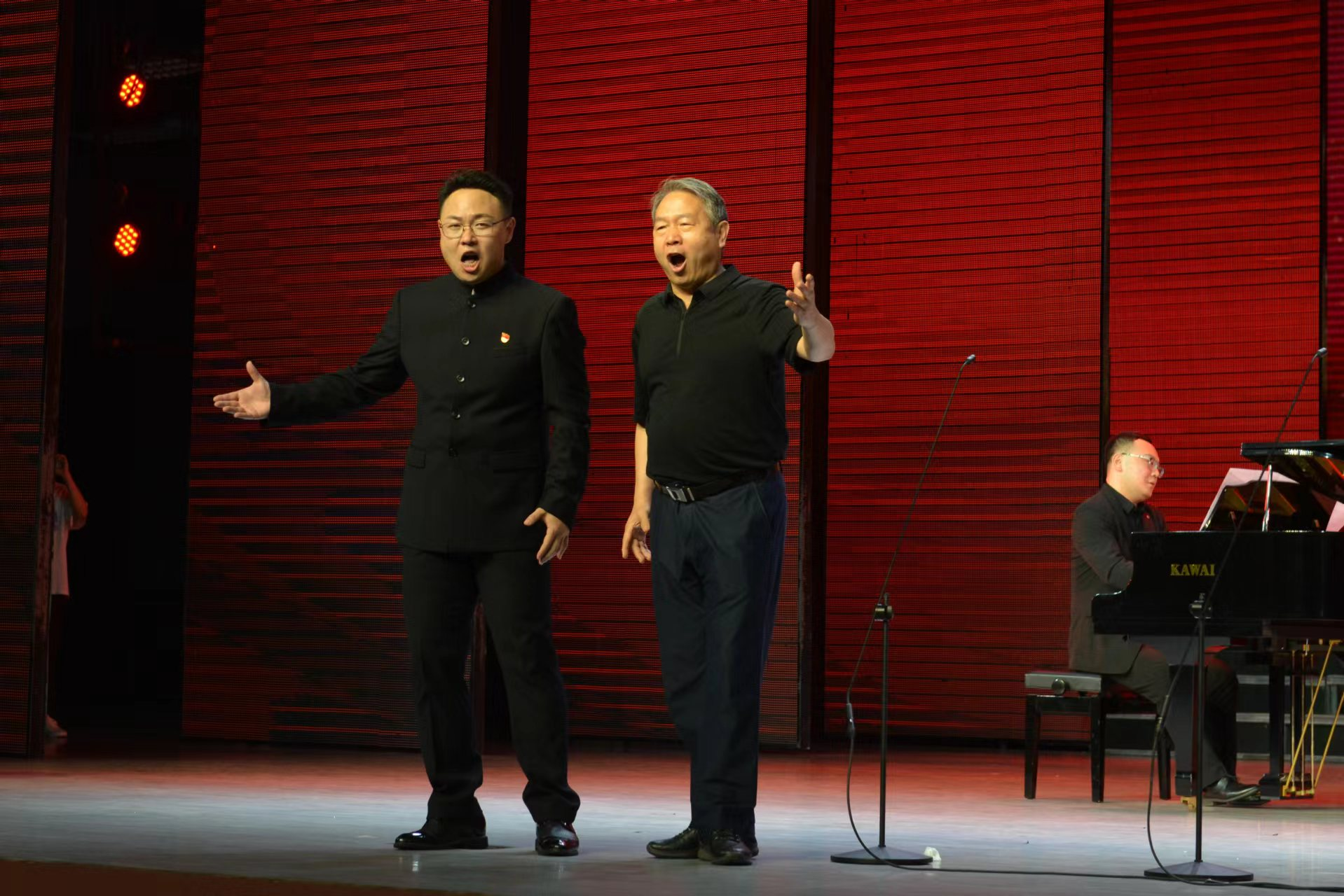 音乐会的尾声,我省知名男高音歌唱家、中国音乐家协会理事、河南省音乐家协会驻会副主席李新现应邀登场献唱,他与董荻、汤莉同唱《唱支山歌给党听》《我爱你中国》将整场音乐会推向了高潮,全场观众起立并报以长时间的热烈掌声。