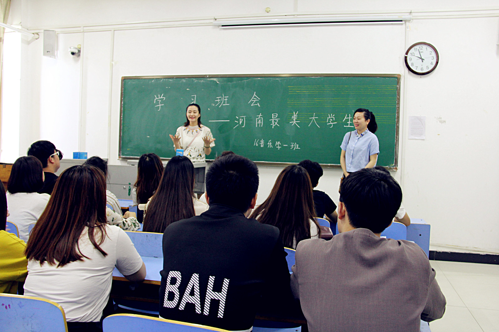 为了教育和引导员工树立正确的世界观、人生观和价值观,培养员工良好的道德情操,5月10日上午10点,16级音乐学1班团支部在A406教室召开了学习“河南最美老员工”主题班会活动。活动由成长导师王凤超、学业导师王怡涵主持。