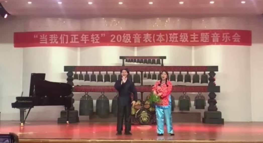 民歌对唱«卖扁食»——这是一首河南民歌,歌曲曲调欢快,节奏轻松,唱出劳动人民在劳动中的轻松快活、悠然自的心态。演唱者用一些形象的肢体动作,把音乐会推上一个小高潮。