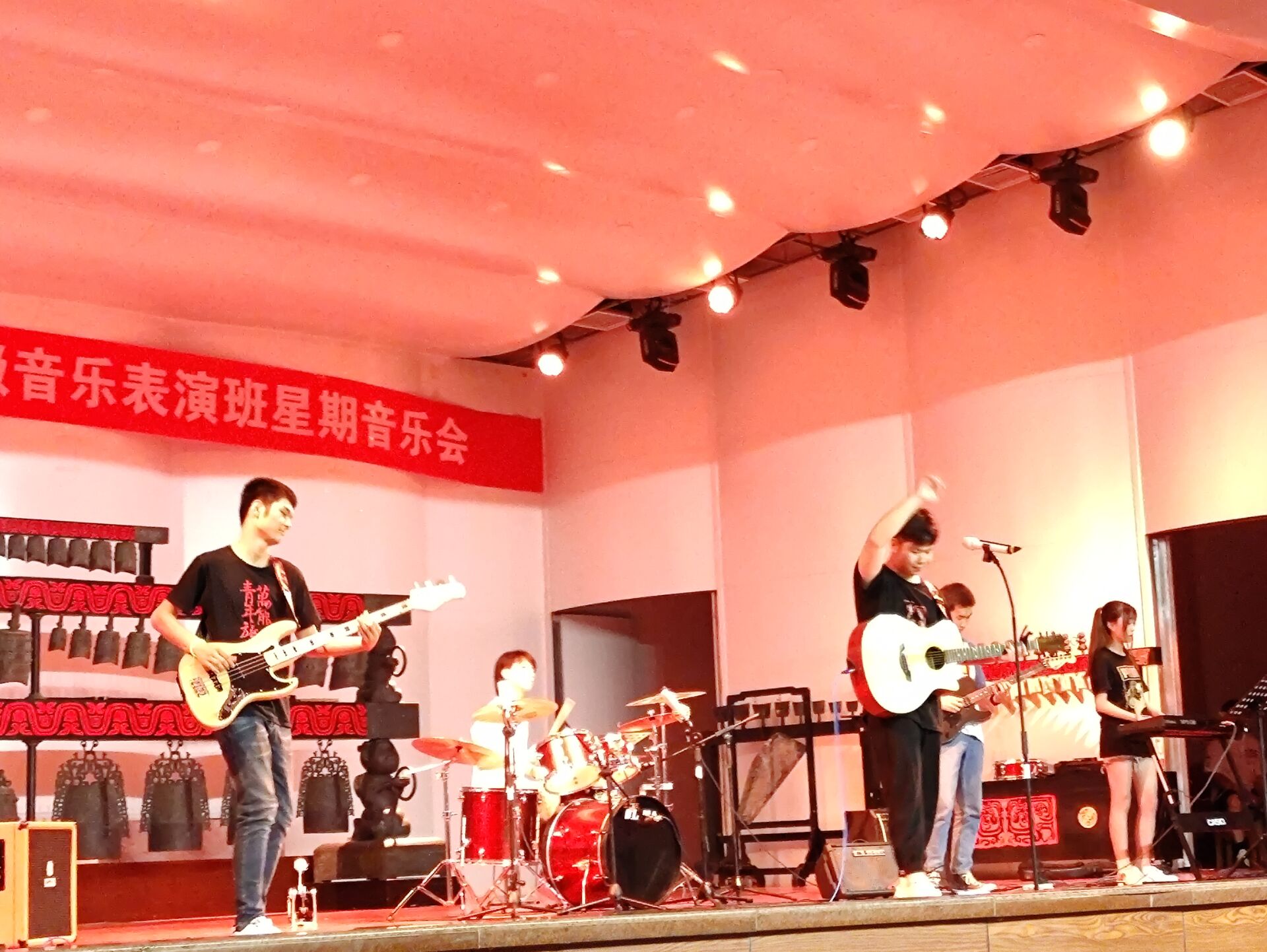 此次音乐会形式众多,节目新颖,有乐队演奏、独唱、器乐合奏、弹唱、女声重唱、舞蹈等。乐队演奏《西游记》作为开场节目,别出心裁的表演形式引起了现场观众的阵阵掌声,活跃了现场气氛。舞蹈《红船》为庆祝建党百年,时而激昂时而凄凉的音乐跌宕起伏,扣人心弦,配合表演者们的舞蹈,让人体会到了共产党当年面临的艰难处境和党员们一心向党,不畏困难的决心,催人泪下。器乐合奏《囍》《梦回临安》演绎的婉转柔美,让人聆听如痴如醉。紧接着同学们带来的舞蹈《东方红》,欢快的节奏,动感的音乐使音乐会的气氛达到了高潮。整场音乐会算得上是炉火纯青,内容精彩,歌声如天籁,琴声如流水,振奋人心。