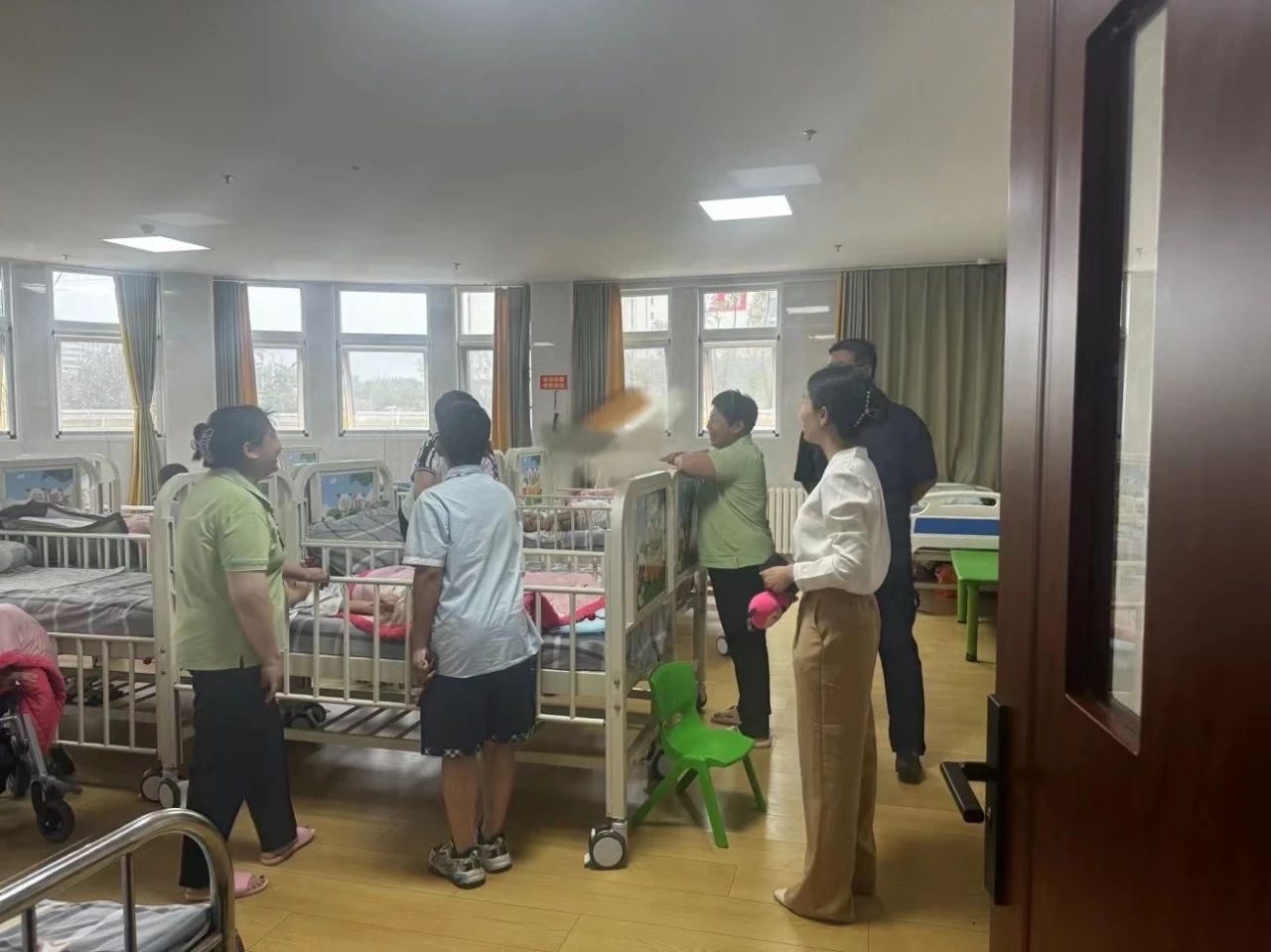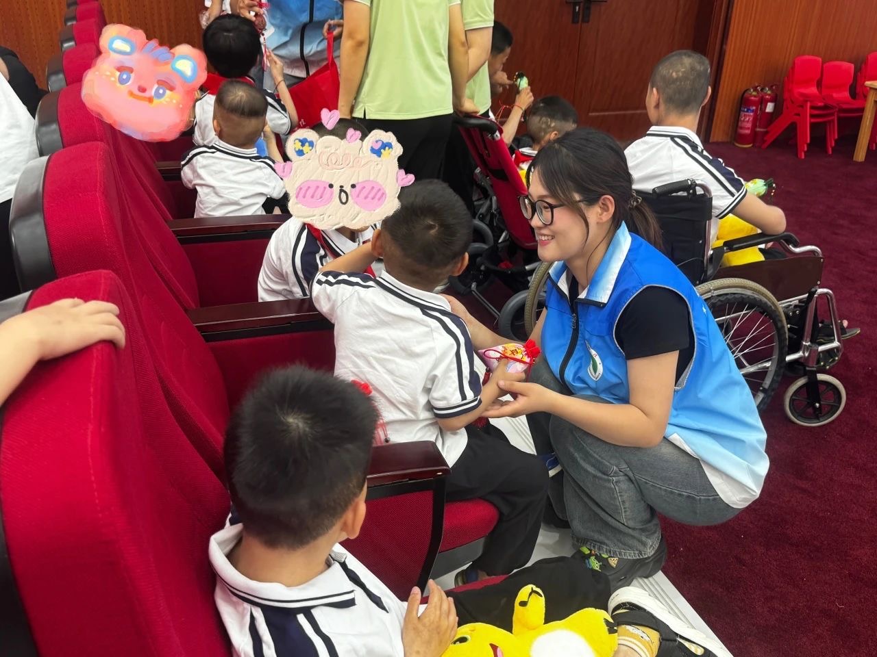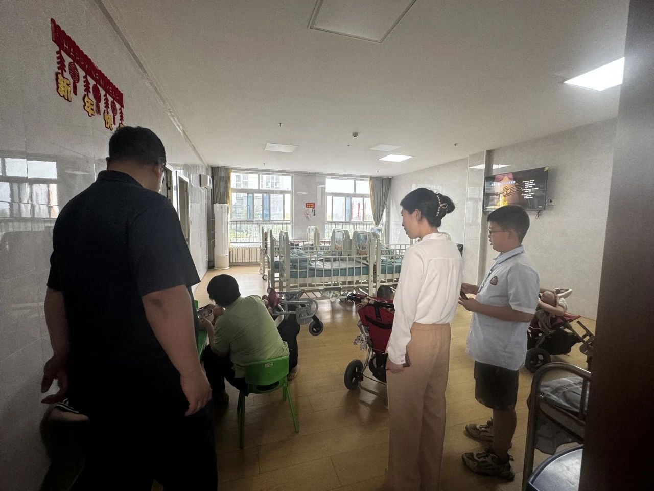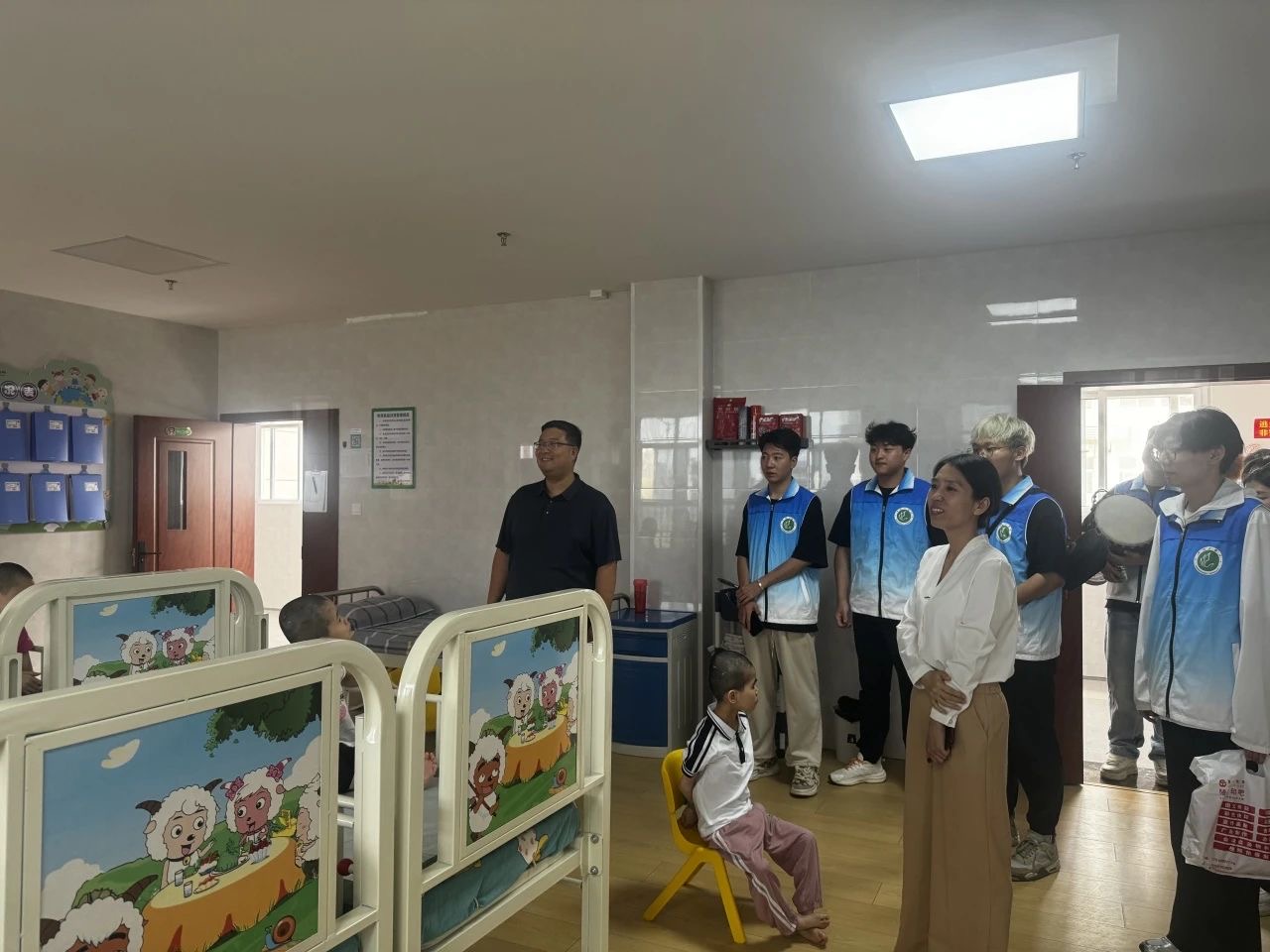 演出结束后,在王经理的带领下、福利院工作人员的陪同下,党团志愿者们一行人来到福利院养育部,对没有参加演出的特殊儿童们进行慰问,亲切的看望孩子们,仔细询问了孩子们的身体状况与生活健康情况,志愿者们感触很深,纷纷表示幸福生活的来之不易。