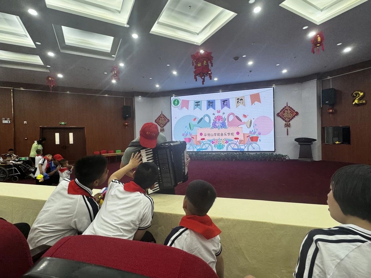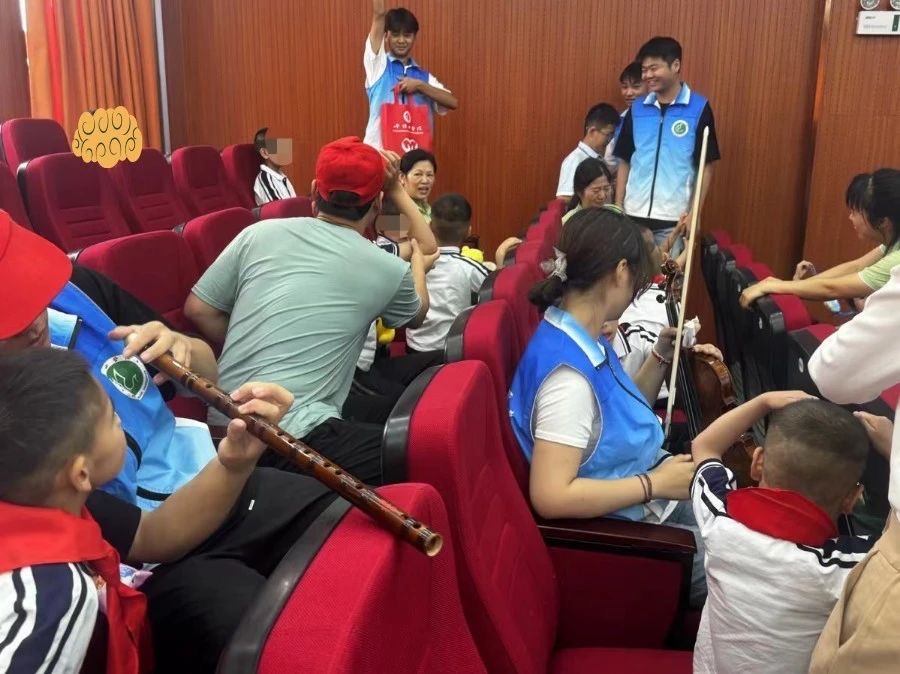 志愿者王传祎、李凯、赵晟洋携带小提琴、手风琴、竹笛为孩子们带来器乐合奏《粉刷匠》