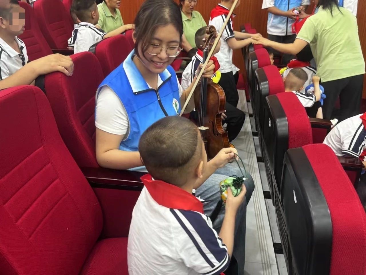 党团志愿者们与孩子们一同奏响了手中的乐器,为孩子们上了一节特别的音乐美育教育课,现场欢声笑语,掌声不断。