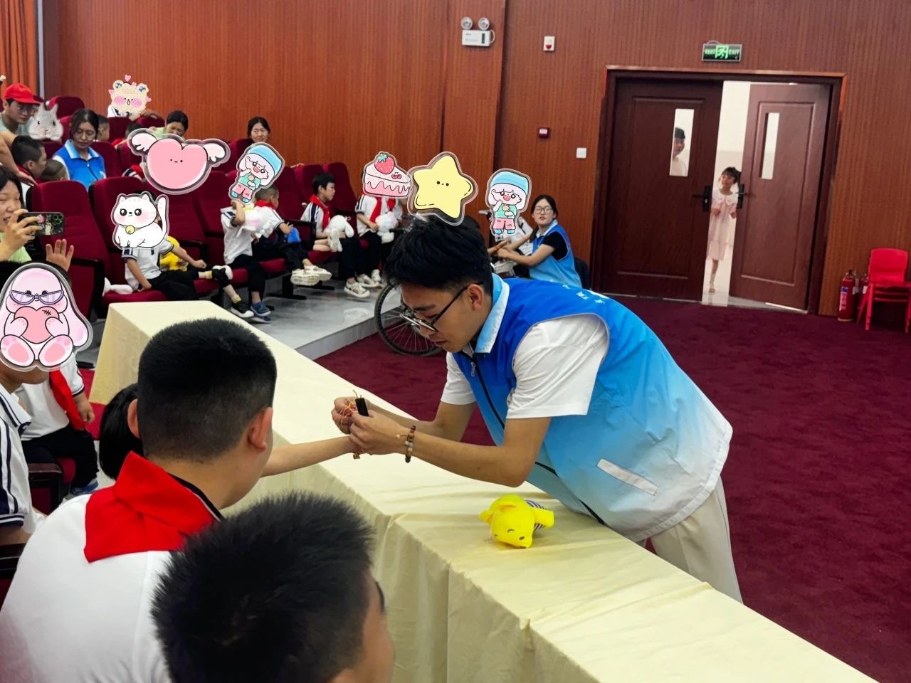 节目过后,党团志愿者们与孩子们进行游戏互动,通过互动环节——“猜花”,为在场的孩子们送上彩色铅笔、蜡笔、文具盒等学习文具,正值端午节到来之际,志愿者们亲手为孩子们系上福气五彩绳、端午节香包,祝愿孩子们健康平安、健康成长、快乐相伴,现场的孩子们笑语欢歌、其乐融融。