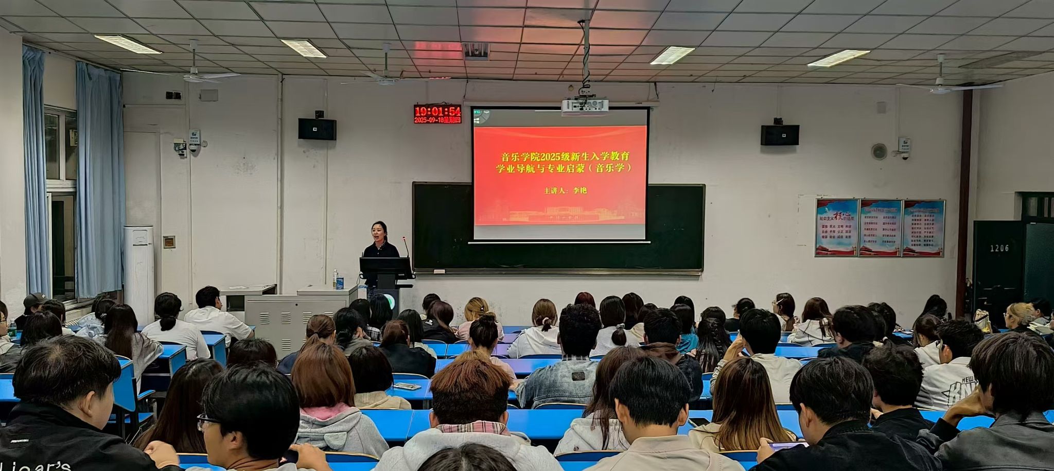 讲座现场,气氛热烈而有序。音乐学班的主讲人李艳老师,从专业课程体系、学科发展脉络入手,结合自身教学经验,为新生们梳理了大学四年的学业进阶路径。她强调,音乐学专业不仅要夯实乐理、和声等理论基础,更要注重教学实践与科研能力的培养,鼓励大家多参与传统音乐调研、音乐教育见习等活动,在理论与实践的碰撞中提升专业素养。