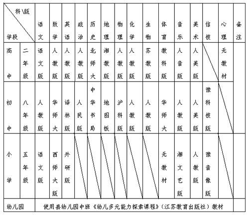 面试教材使用淮阳县中小学、幼儿园2015年春季教材。其中,高中心理科内容由专家临时命题,高中体育与健康为高中全一册;初中化学使用九年级教材,体育与健康为八年级全一册;小学体育科面试内容使用八年级全一册教材。