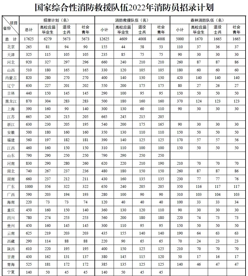 经应急管理部、人力资源社会保障部批准,此次国家综合性消防救援队伍共招录消防员17625名(均为男性),其中:高校应届毕业生6279名、退役士兵5673名、社会青年5673名。具体招录计划见附件1。
