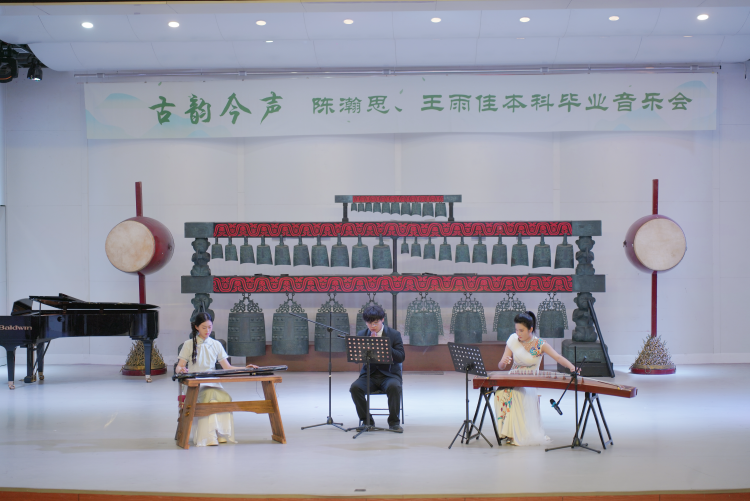 中场由陈瀚思、王雨佳、赵晟洋演奏的《梅花三弄》进行过渡,三人的合奏生动体现出了梅花凌霜傲寒、高洁不屈的节操与气质,仿若看到了魏晋文人超尘脱凡、孤芳自赏的胸臆。