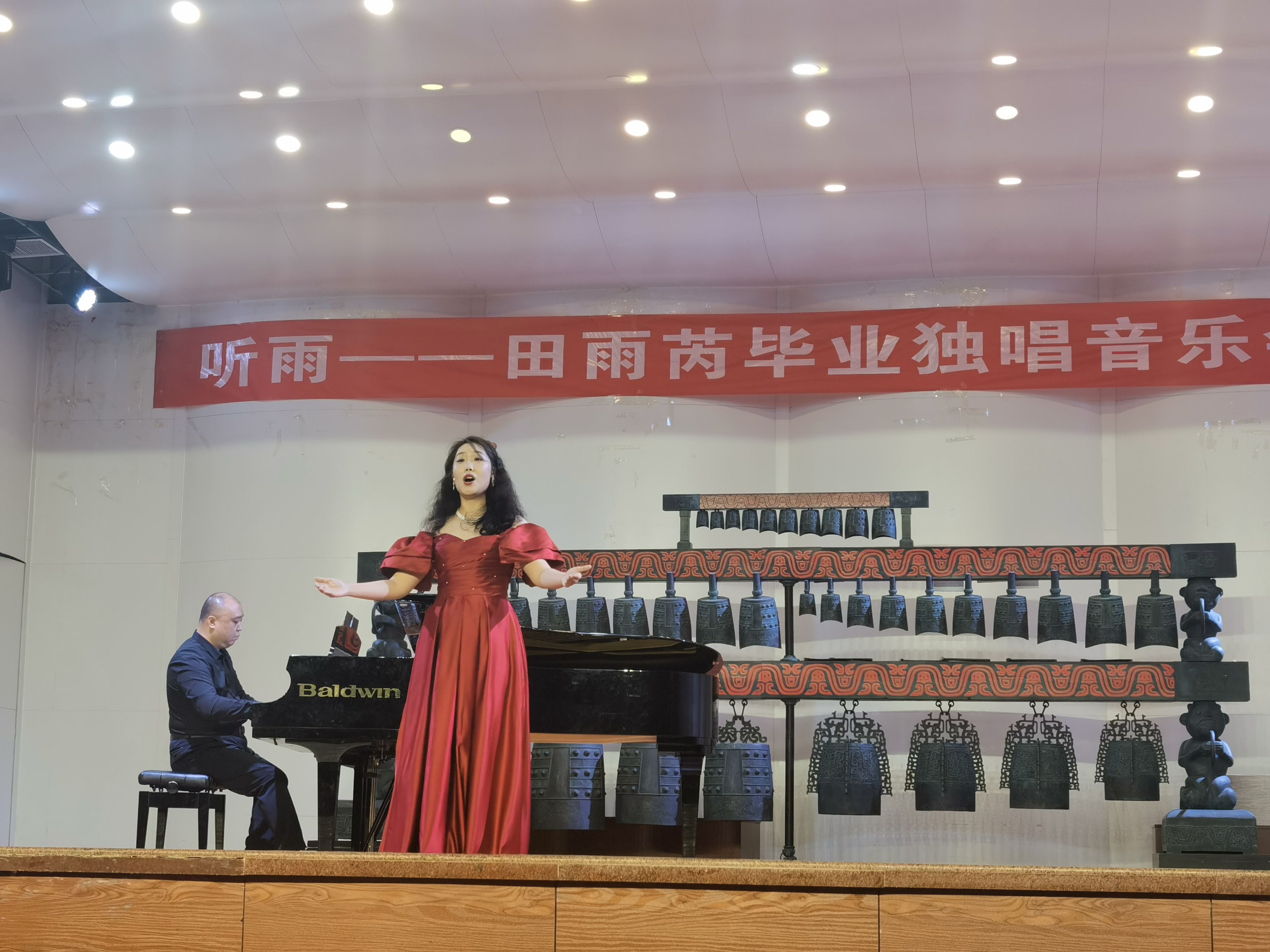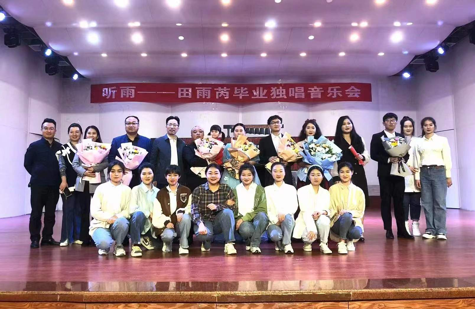 音乐会在一首轻松优美的《锦瑟》中拉开了序幕,田雨芮在倾情的演唱中,仿佛让人追忆到了自己的青春年华,伤感释怀,悠扬的歌声为这首古诗词焕发了新的生机。艺术歌曲《钗头凤》是一首旋律优美、略带伤感的经典声乐作品,在田雨芮同学深情的演绎下,表现出了人们眷恋之深和相思之切的感情。富有难度的声乐作品《青玉案·元夕》在变幻的情绪中娓娓道来、边舞边唱的《一杯美酒》更是别有一番民族风味、欢快的《火把节的欢乐》让人听的如痴如醉、《燕子》等歌曲的精准表达,充分体现了田雨芮同学扎实的演唱水平。最后和两位特约嘉宾同学一起表演了原创歌剧《运河谣》,进一步体现了同学们在声乐学习方面的全面性和系统性,也体现了公司在专业教学和舞台实践方面的成绩。本次毕业独唱音乐会在一阵阵欢呼喝彩声中圆满落下帷.