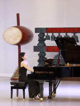 音乐会上半场以贝多芬《悲怆奏鸣曲》为开篇,岳濛钰以精准的力度控制演绎出第一乐章中命运叩问的震撼,又在第二乐章以细腻触键勾勒出希望微光,展现了对古典作品的深刻理解。随后的肖邦作品《降D大调圆舞曲》灵动的回旋音型再现“小狗圆舞曲”的童趣生机,《f小调第四叙事曲》则在诗意织体中透露出成熟的艺术把控力,彰显演奏者四年专业积淀。下半场创新演绎凸显文化融合特色。双排键电子管风琴版《红旗颂》以现代音色重塑红色经典,与小提琴合作的《一步之遥》在探戈韵律中碰撞出器乐对话的火花。当《夕阳箫鼓》的东方意境从钢琴流淌而出,水墨山水在音韵间徐徐舒展;双钢琴版《茉莉花》以复调技法解构江南韵律,传统民歌焕发新生。音乐会最终在双钢琴澎湃奏响的《黄河颂》中达到高潮,琴键间奔涌的民族气魄令观众心情澎湃。